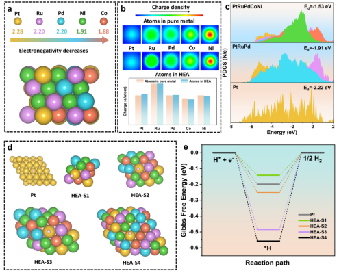 高熵合金(HEA)具有獨特的熱穩定性和電子特性,在電催化反應中表現出巨大的應用潛力。然而,精確控制HEA納米尺寸仍然是一個挑戰,尤其是對于超小的HEA納米顆粒。研究團隊首先通過理論計算,研究了HEA納米尺寸對于其電子結構的調控作用,以及對典型電催化反應(析氫反應、CO2電還原、硝酸根還原)關鍵中間體的吸脫附強度的影響(圖1)。