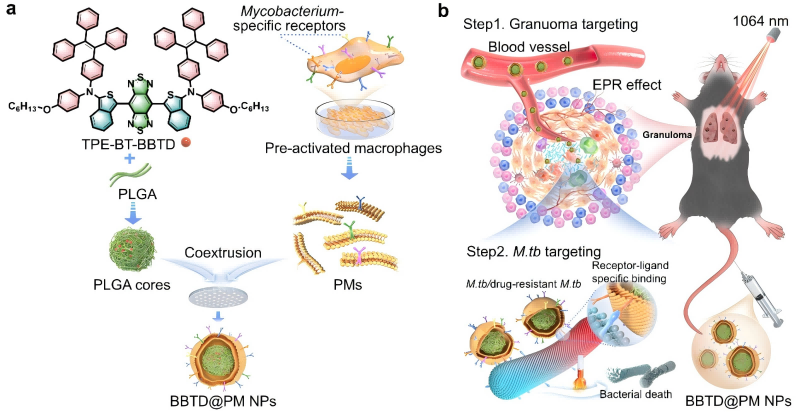 本論文詳細闡述了BBTD@PM仿生納米用于肺結核一體化診療的標準化方法(圖1),內容主要包括以下關鍵步驟:(1)NIR-II聚集誘導發光分子TPE-BT-BBTD的合成;(2)巨噬細胞的預激活處理;(3)預激活巨噬細胞膜的提取與純化;(4)基于共擠壓法制備BBTD@PM仿生納米;(5)活體小鼠肺結核的NIR-IIb熒光成像及體內成像引導的光熱抗結核分枝桿菌治療。值得注意的是,這種具有高診療性能與精準靶向特性的NIR-II聚集誘導發光一體化仿生納米診療平臺,還可拓展應用于其他病原體相關疾病的診療當中。