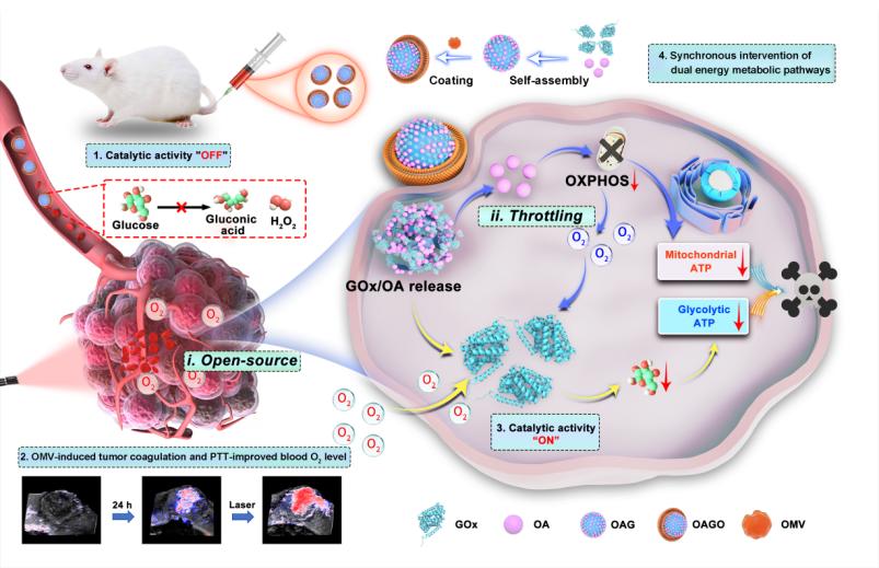 腫瘤細胞通過代謝重編程依賴糖酵解和氧化磷酸化(OXPHOS)雙重途徑獲取能量,單一代謝抑制易引發代償效應,限制治療效果。現有的雙重代謝抑制藥物存在靶向性差、毒副作用大等問題,且腫瘤微環境(TME)的缺氧特性進一步削弱了氧依賴性酶催化療法的效果。本研究提出“開源節流”的氧氣(O2)調控策略,構建了一種同步干預雙能量代謝途徑的抗腫瘤納米平臺(OAGO)。該平臺由葡萄糖氧化酶(GOx)和寡霉素A(OA)自組裝而成,并包被細菌外膜囊泡(OMVs)。OAGO在酸性TME中解離,釋放OA和GOx,恢復酶活性。通過GOx介導的糖酵解阻斷和OA誘導的OXPHOS抑制,實現雙能量代謝途徑的同步干預。GOx催化生成的過氧化氫導致腫瘤氧化應激,并加劇線粒體功能損傷。同時,抑制OXPHOS可減少O2消耗,從而改善TME中的缺氧(即“節流”策略)。OMV不僅增強OAGO在腫瘤內的蓄積,還通過破壞腫瘤血管和誘導紅細胞外滲來提高腫瘤的血氧飽和度(即“開源”策略)。此外,OMV誘導的腫瘤凝血用于體內光熱療法,進一步提升腫瘤血氧水平和局部溫度,為GOx催化提供了有利條件。在三陰性乳腺癌小鼠腫瘤模型上,OAGO表現出優異的抗腫瘤療效,揭示了O2調節與能量代謝途徑的同步干預在GOx療法中的重要性,為新型抗腫瘤治療策略的開發提供了新思路。