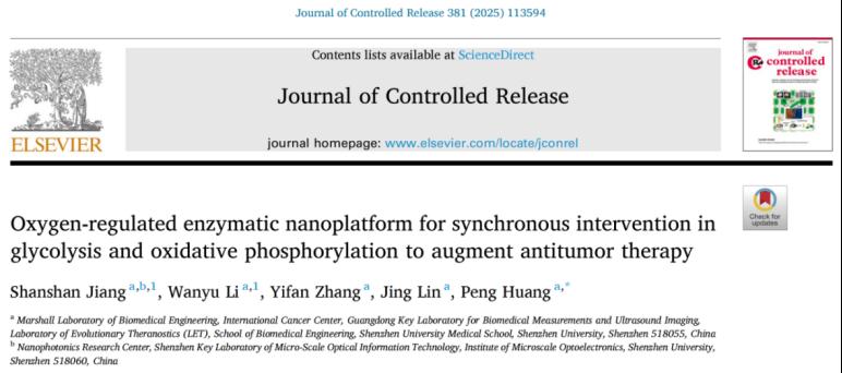 近日,深圳大學醫學部生物醫學工程學院黃鵬特聘教授團隊以封面論文在藥劑學國際權威期刊Journal of Controlled Release(影響因子10.5,中科院一區,TOP期刊)上發表了題為“Oxygen-regulated enzymatic nanoplatform for synchronous intervention in glycolysis and oxidative phosphorylation to augment antitumor therapy”的研究論文。醫學部博士后江珊珊和碩士研究生李婉鈺為共同第一作者,教授黃鵬為通訊作者,深圳大學為獨立完成單位。團隊所在的生物醫學工程學科屬于廣東省優勢重點學科。