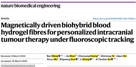論文信息:Ben Wang?*, Jie Shen?, Chenyang Huang?, Zhicheng Ye, Jiajun He, Xinyu Wu, Zhiguang Guo, Li Zhang*, Tiantian Xu*, Magnetically-driven biohybrid blood hydrogel fibres for personalized intracranial tumour therapy under fluoroscopic tracking.Nature Biomedical Engineering2025, DOI: 10.1038/s41551-025-01382-z.