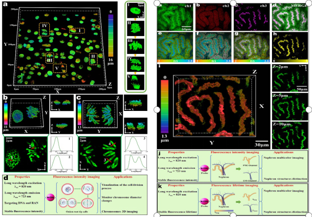可視化活細胞中核酸(DNA和RNA)的形態和動力學是了解它們在調節生物體生長、發育和繁殖中如何發揮作用的關鍵。然而,目前缺乏能夠同時靶向DNA和RNA的有效探針,以及分析它們在生物體中的分布和相對比例的工具。因此,本研究成功制備一種具有雙光子吸收的氟-氮共摻雜碳點(F-NCDs),該F-NCDs表現出穩定的熒光、良好的生物相容性和對核酸(DNA和RNA)敏感的熒光壽命。以F-NCDs為探針結合雙光子熒光壽命成像技術(TP-FLIM)的多色成像能力來定量區分DNA和RNA在細胞核中的分布情況。該方法可以有效追蹤不同分裂階段植物細胞核(洋蔥根尖)中DNA/RNA分布的變化和區分動物組織(斑馬魚)的細胞種類。