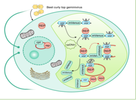 作為最具潛力的光合細胞工廠,目前萊茵衣藻葉綠體合成生物學平臺受限于葉綠體基因組外源基因表達水平及同質化篩選的技術難題。為了解決這一瓶頸問題,本研究利用甜菜卷曲頂部病毒的復制元件Rep蛋白及(vor)序列,開發了一套萊茵衣藻葉綠體的附加體外源基因表達系統(圖1)。