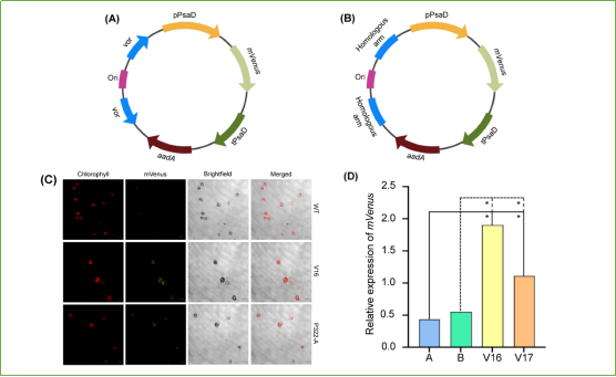 該研究通過在萊茵衣藻核基因組中表達Rep蛋白,構建了附加體遺傳系統的底盤藻株,并利用mVenus熒光蛋白對該系統進行驗證,實現了比傳統萊茵衣藻葉綠體基因組同源重組方法更高效的外源基因表達水平(圖2)。