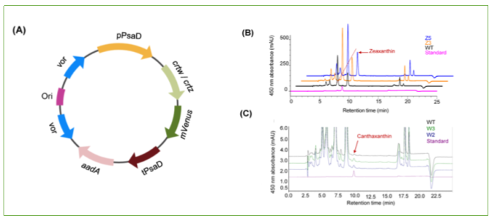 該系統利用附加體遺傳系統表達crtzcrtw基因,使萊茵衣藻細胞的玉米黃質和角黃素等高價值類胡蘿卜素含量明顯增加(圖3),說明基于病毒復制元件構建的萊茵衣藻葉綠體附加體系統在合成生物制造中具有重要的應用前景。