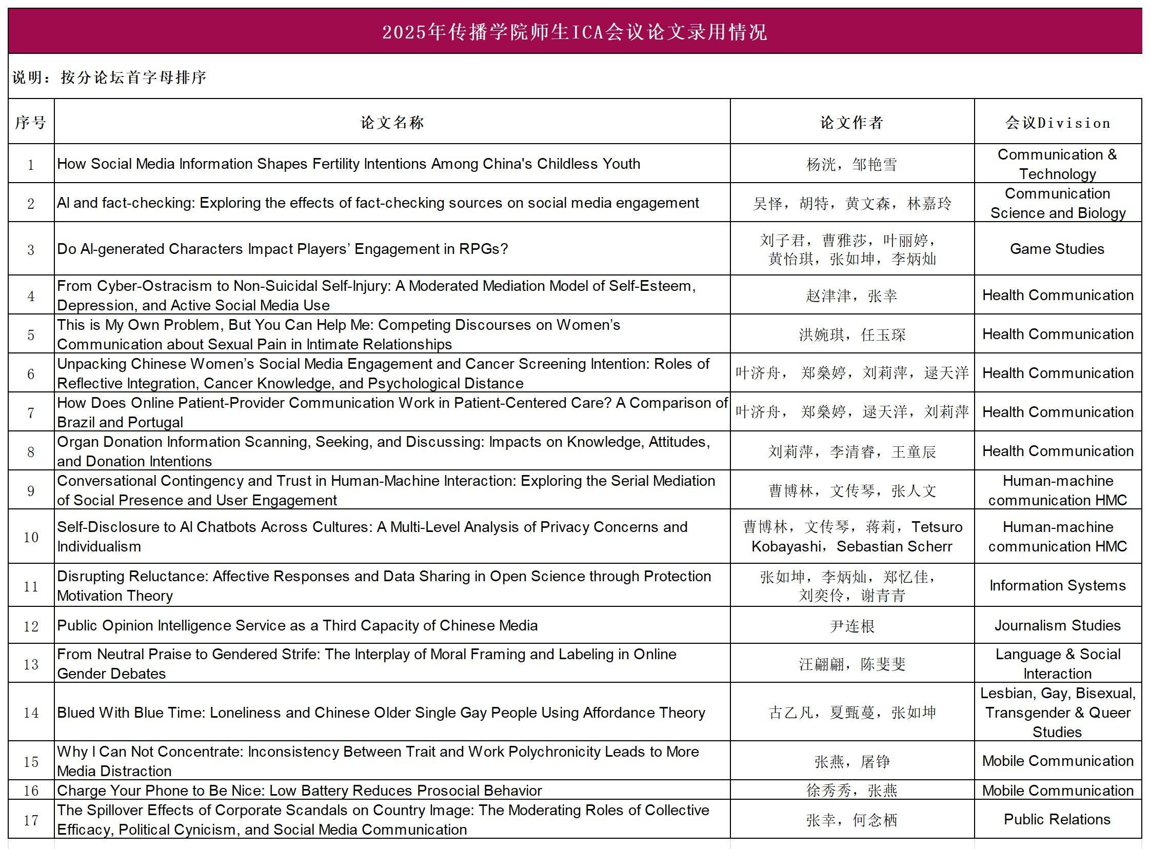傳播學院17篇學術論文獲2025年國際傳播學會(ICA)年會錄用